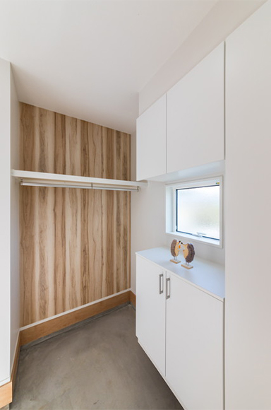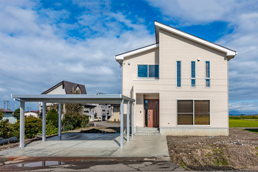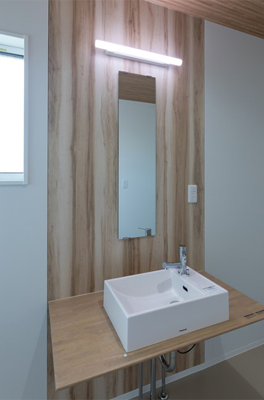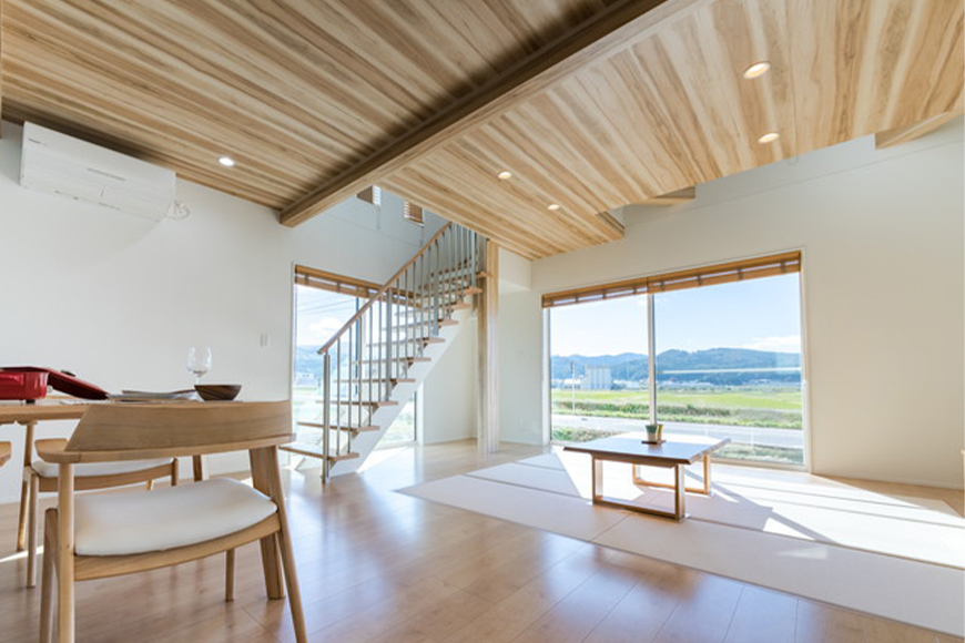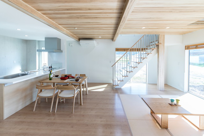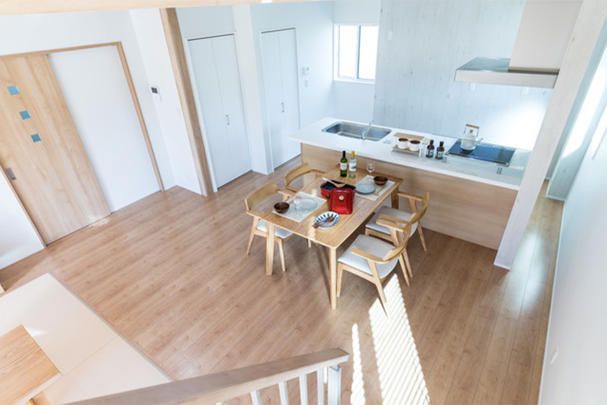 リビング吹抜けとデザイン階段、さらにフラット対面キッチンで開放感のある空間に仕上げました。 洗面脱衣室とバスルームを2階にレイアウトやロフトもお施主様のこだわりです。
