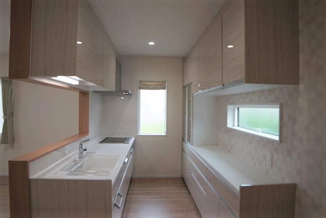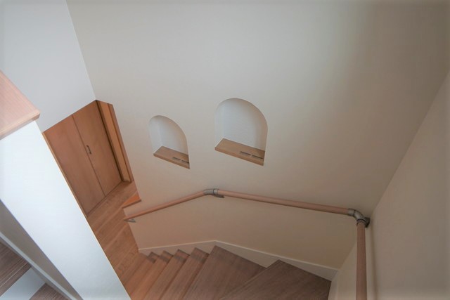 明るい色味のメープルとカームチェリーで木のやさしい雰囲気に包まれた住まい。 階段ニッチもかわいく仕上がりました。