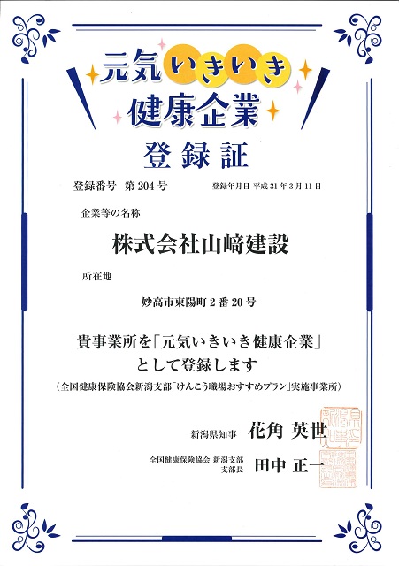 “健康職場おすすめプラン”実施事業所として『元気いきいき健康企業』の登録をしました。